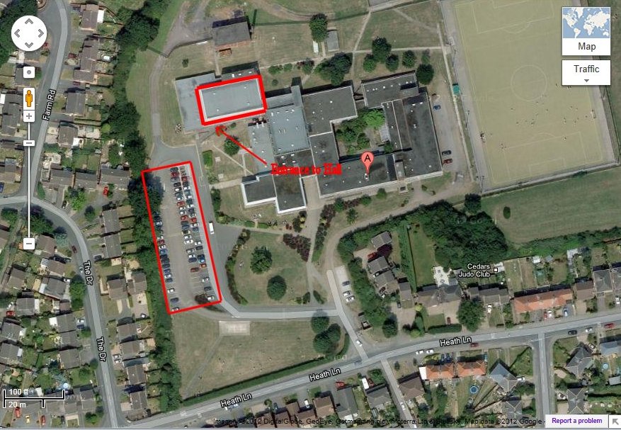 Below is a Google Maps image of the site - I have indicated the car park area, the Sports Hall and the entrance. There are actually 2 entrances to the Sports Hall, a direct one from the covered walkway corridor (where the arrow is), and another one at the rear of the hall which is reached by walking along the corridor at the left end of the hall and along the back. We will have the direct route open until the carpets are down then any late comers will need to make use of the longer route.